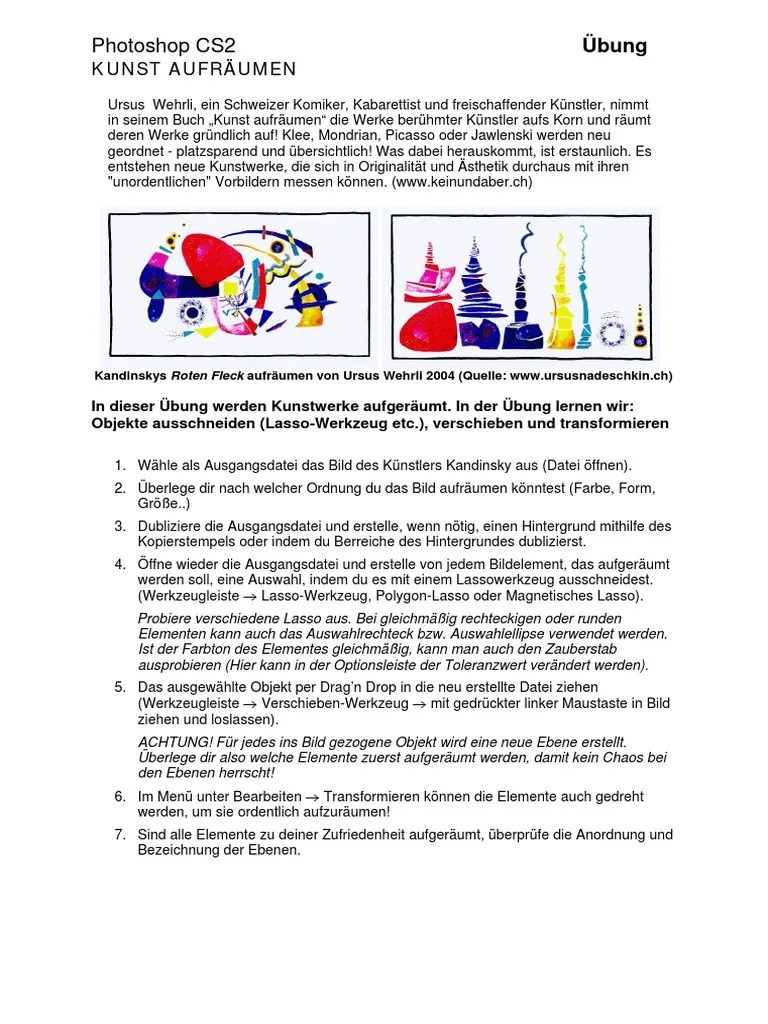 − betrachtung und beschreibung eines werkes der kunst des 20. Ursus wehrli lebt als komiker, kabarettist und freischaffende künstler in zürich. Kandinsky um die mausseite mit allen schönen und bunten grafiken sehen zu können, muss javascript in deinem browser eingeschaltet sein.. Die aufgabenstellung lautete das bild aufzuräumen.